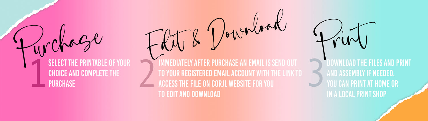 1. After purchasing, you will receive an email from Corjl with a link to access and edit your item. You can also go directly to Corjl.com and use your order info to login and access your purchased items.